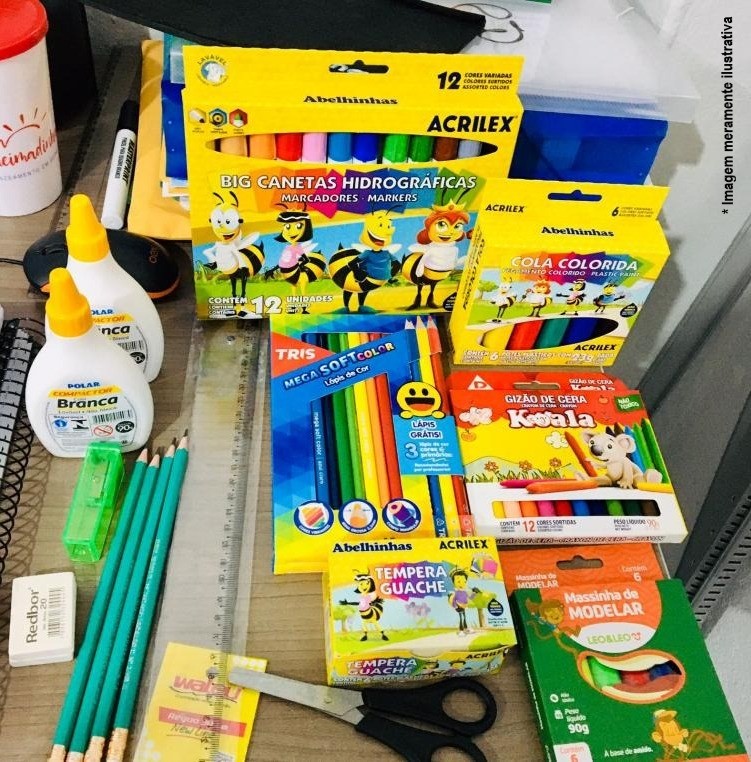 O Kit de material escolar para uso pessoal será composto por mochila, estojo, caderno, lápis de escrever, lápis de cor, borracha, apontador, régua, cola, massa de modelar, tinta guache, giz de cera, tesoura e conjunto geométrico.