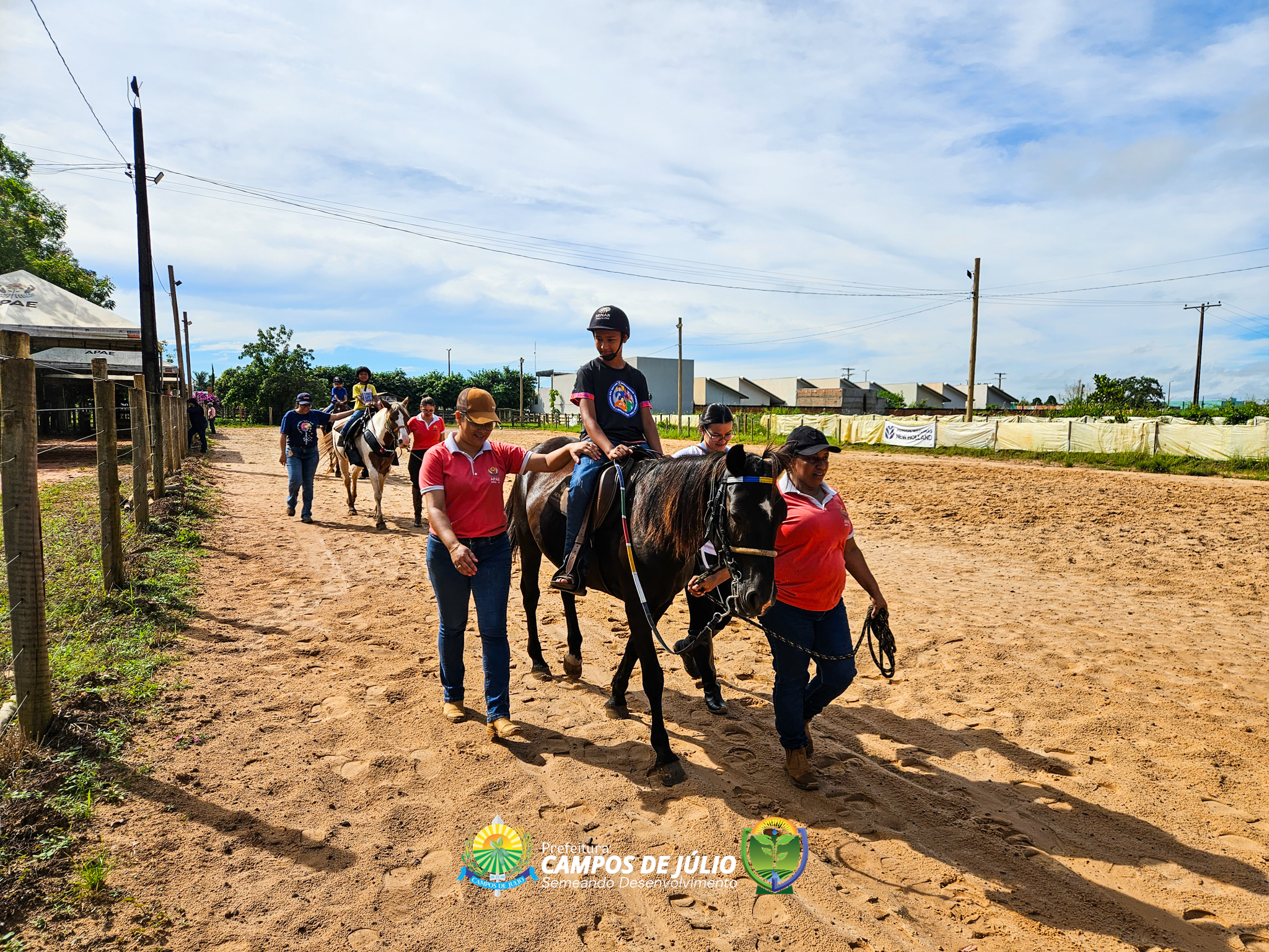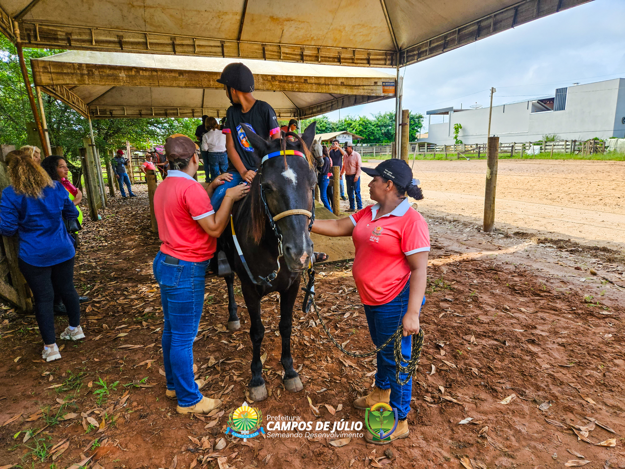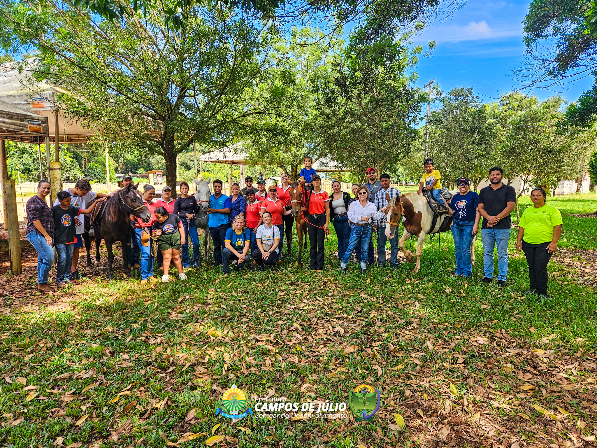 O grupo participou de uma aula experimental de equoterapia no município de Sapezal, com acompanhamento de profissionais especializados da APAE local. A atividade foi cuidadosamente conduzida, proporcionando às crianças uma experiência terapêutica completa, desde o primeiro contato com os cavalos até a montaria, sempre com foco no cuidado, segurança e estímulo ao desenvolvimento.