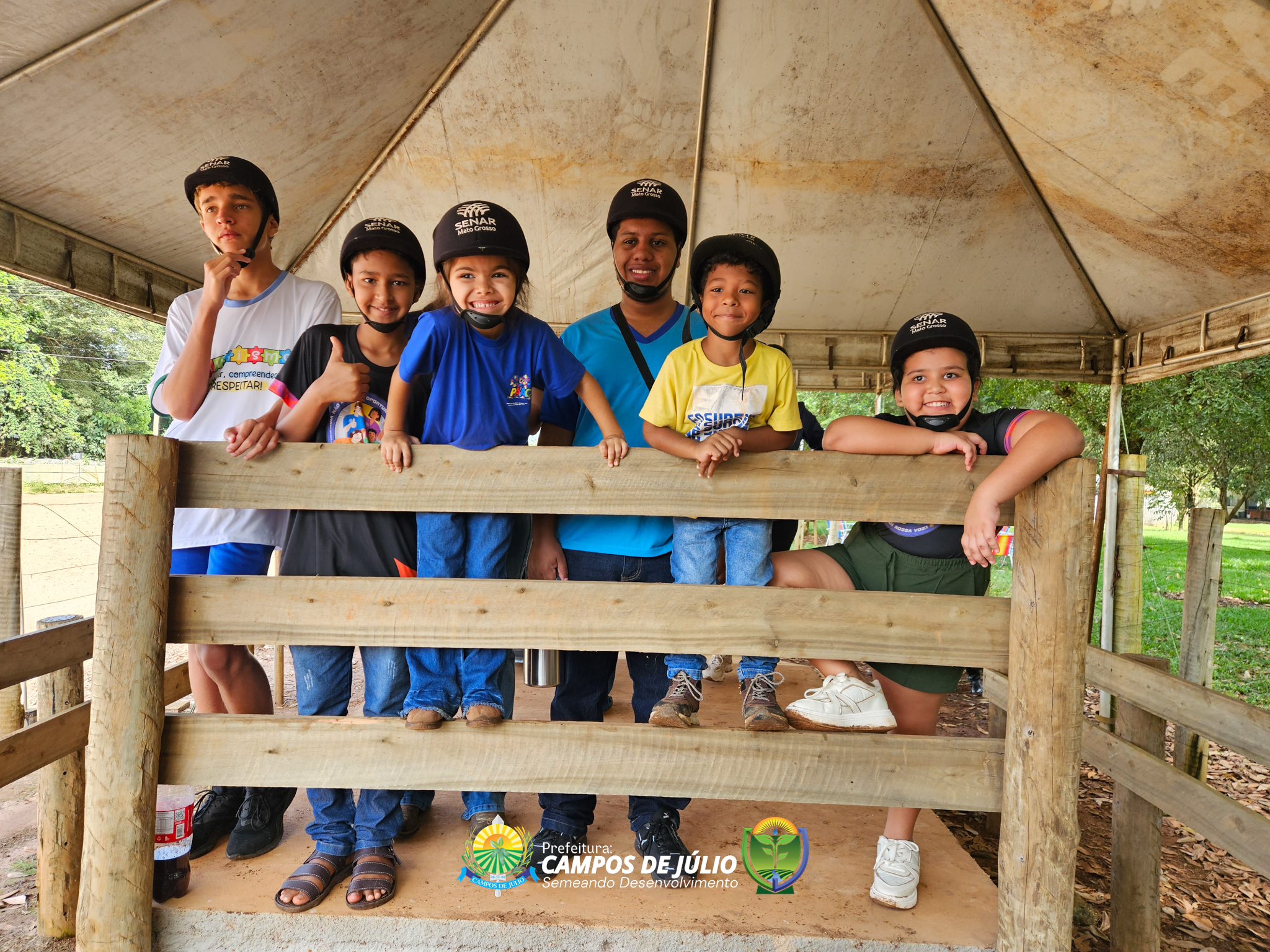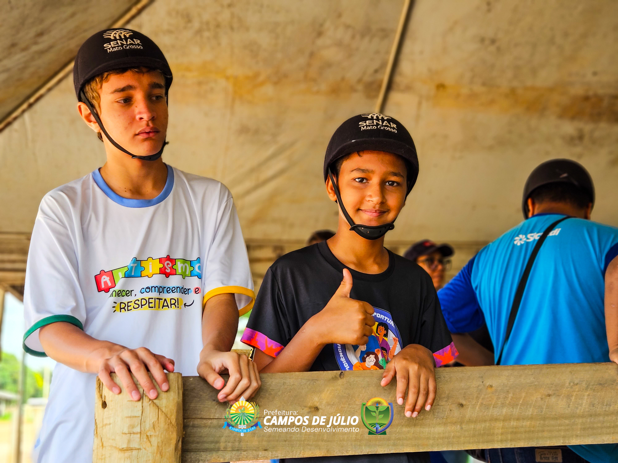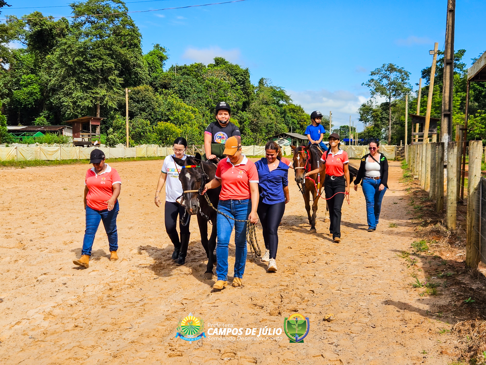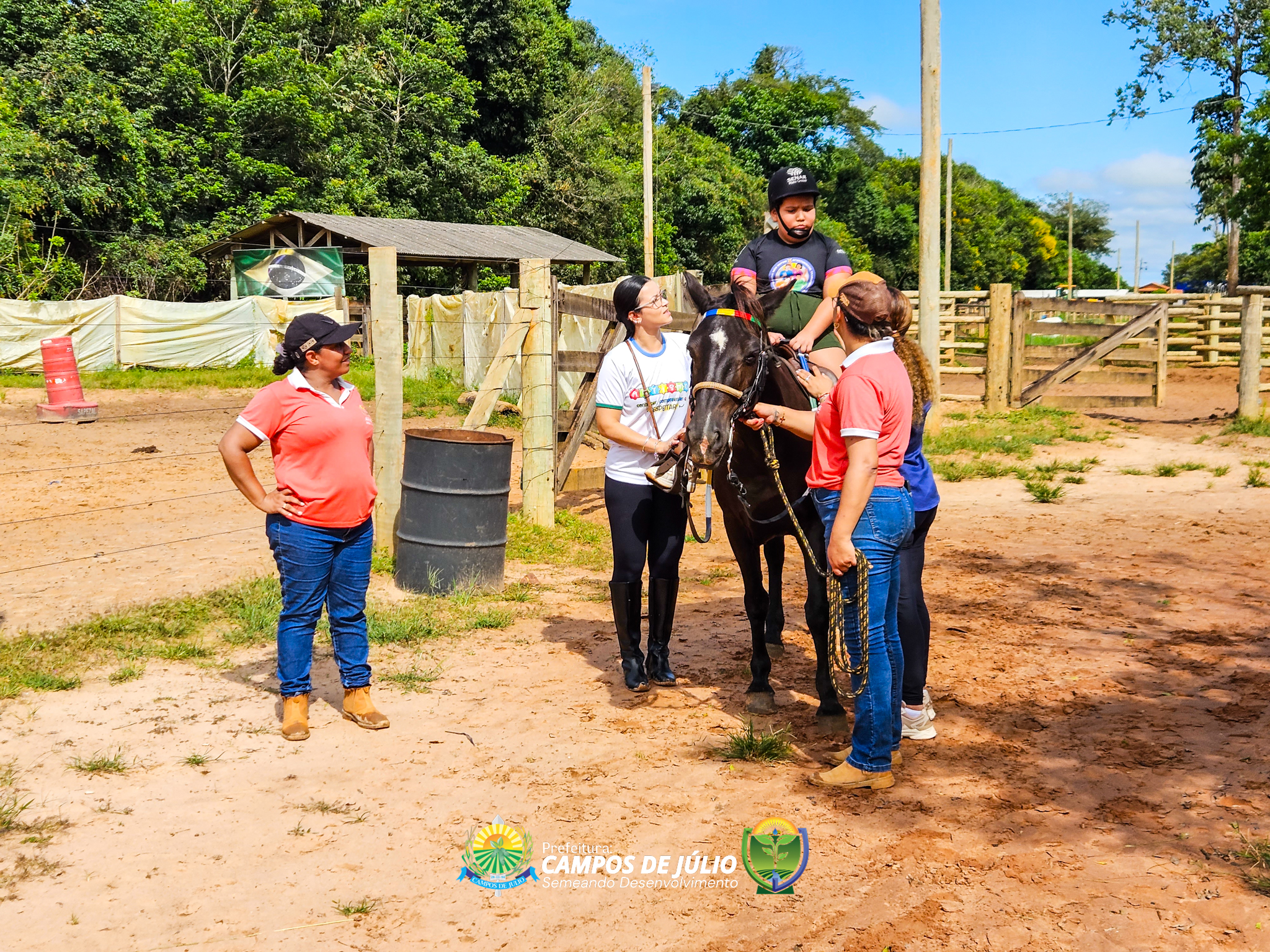 O grupo participou de uma aula experimental de equoterapia no município de Sapezal, com acompanhamento de profissionais especializados da APAE local. A atividade foi cuidadosamente conduzida, proporcionando às crianças uma experiência terapêutica completa, desde o primeiro contato com os cavalos até a montaria, sempre com foco no cuidado, segurança e estímulo ao desenvolvimento.